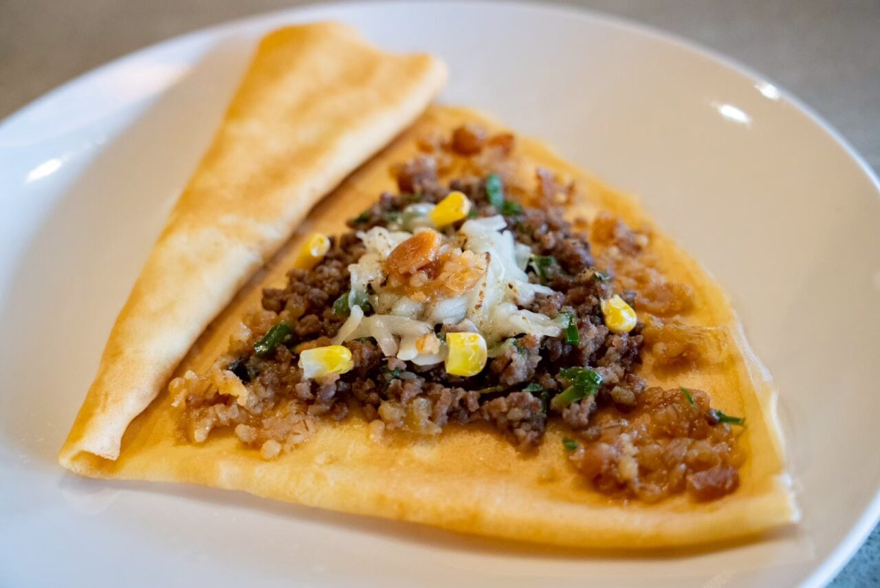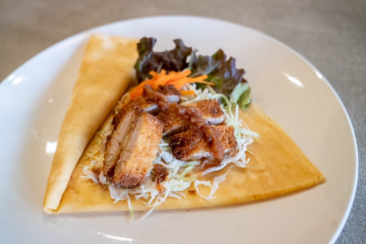 太地町の「重大屋由谷商店」のまぐろカツ、みなべ町の「紀州本庄うめよし」のあんちん梅で作った自家製梅ソースを使用。ジューシーなまぐろカツの旨味と、梅ソースのさっぱりとした酸味が絶妙に調和し、後味は驚くほど軽やか。クレープ生地のほんのりとした甘みが全体をやさしく包み込み、食べ進めるほどに味の一体感が広がります。