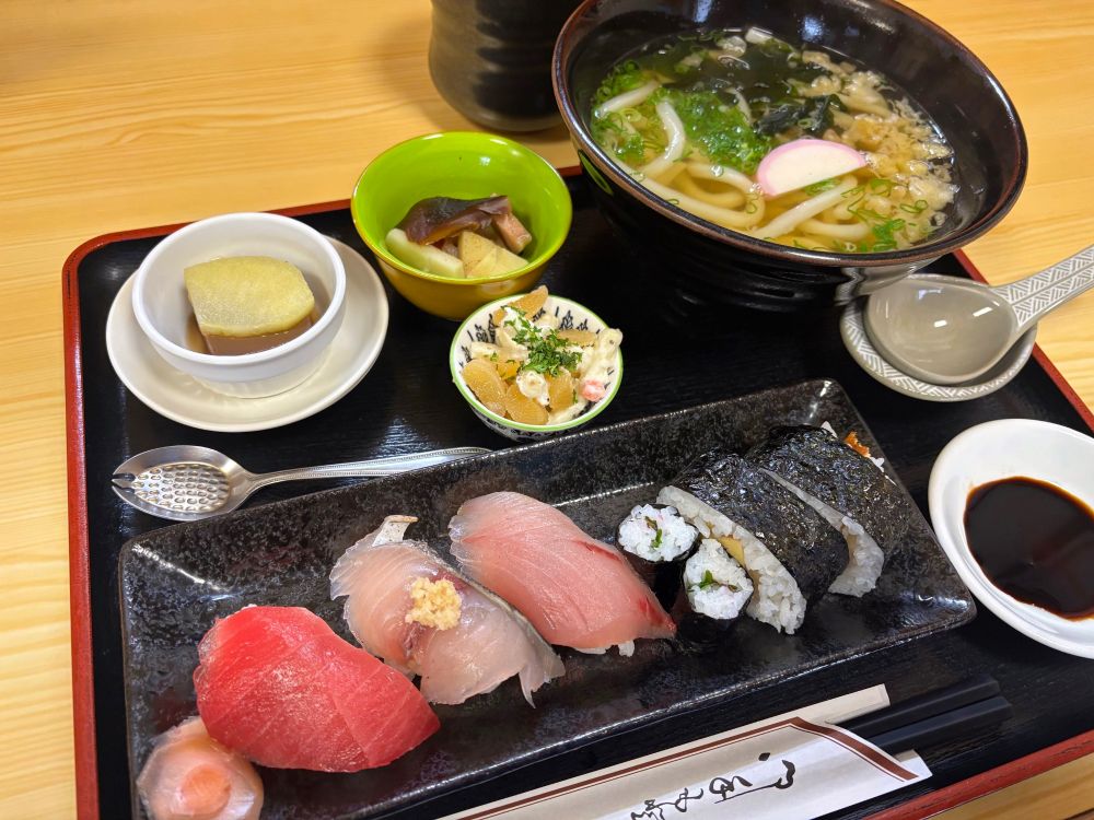 ランチタイムのいち押しは、寿司とうどんの最強コンビ「寿司定食」。にぎり3貫に巻き寿司4個、小鉢3品、さらにうどんが付き、食後にはコーヒーとデザートまで付いて1150円という驚きの価格です。