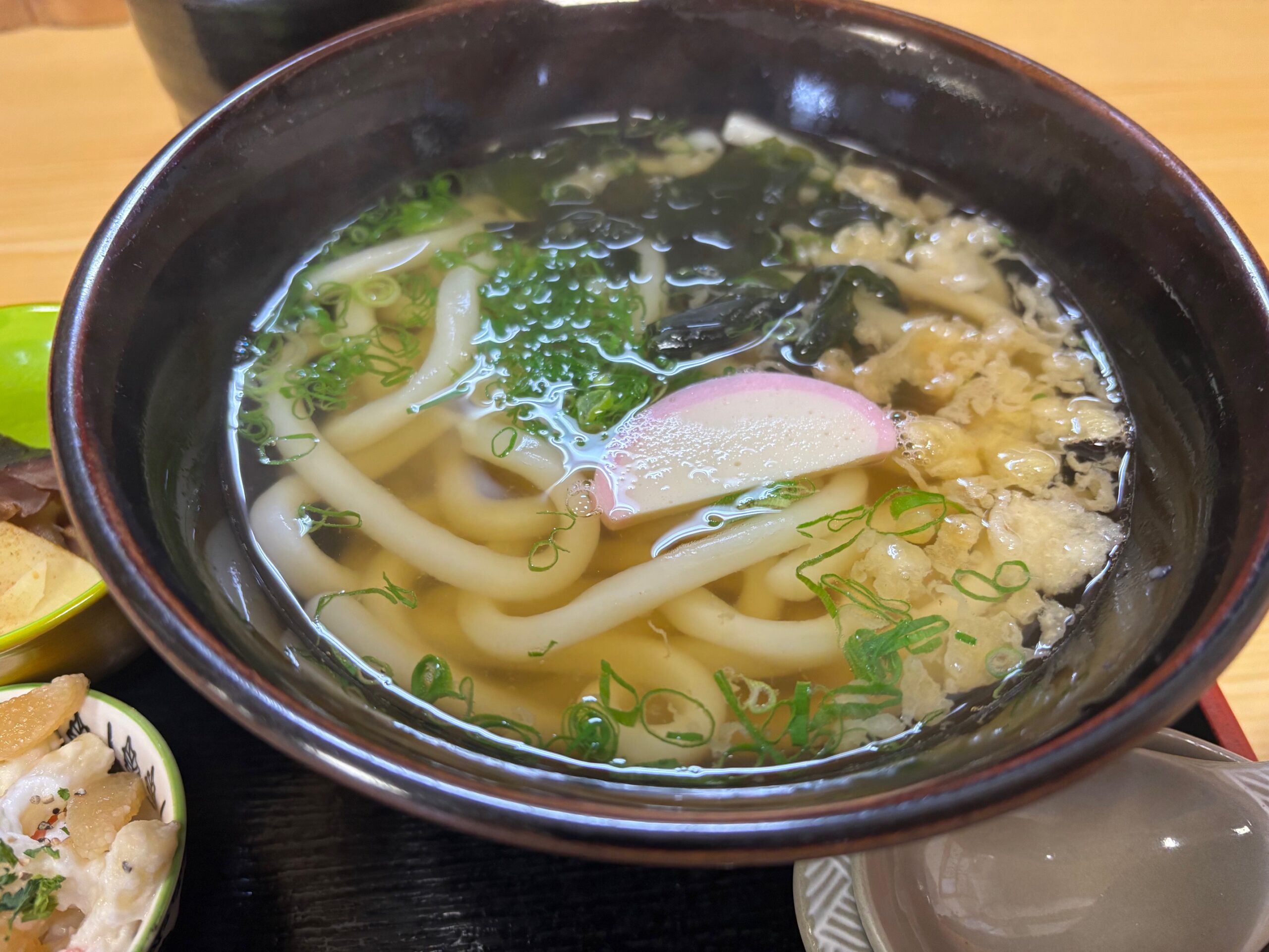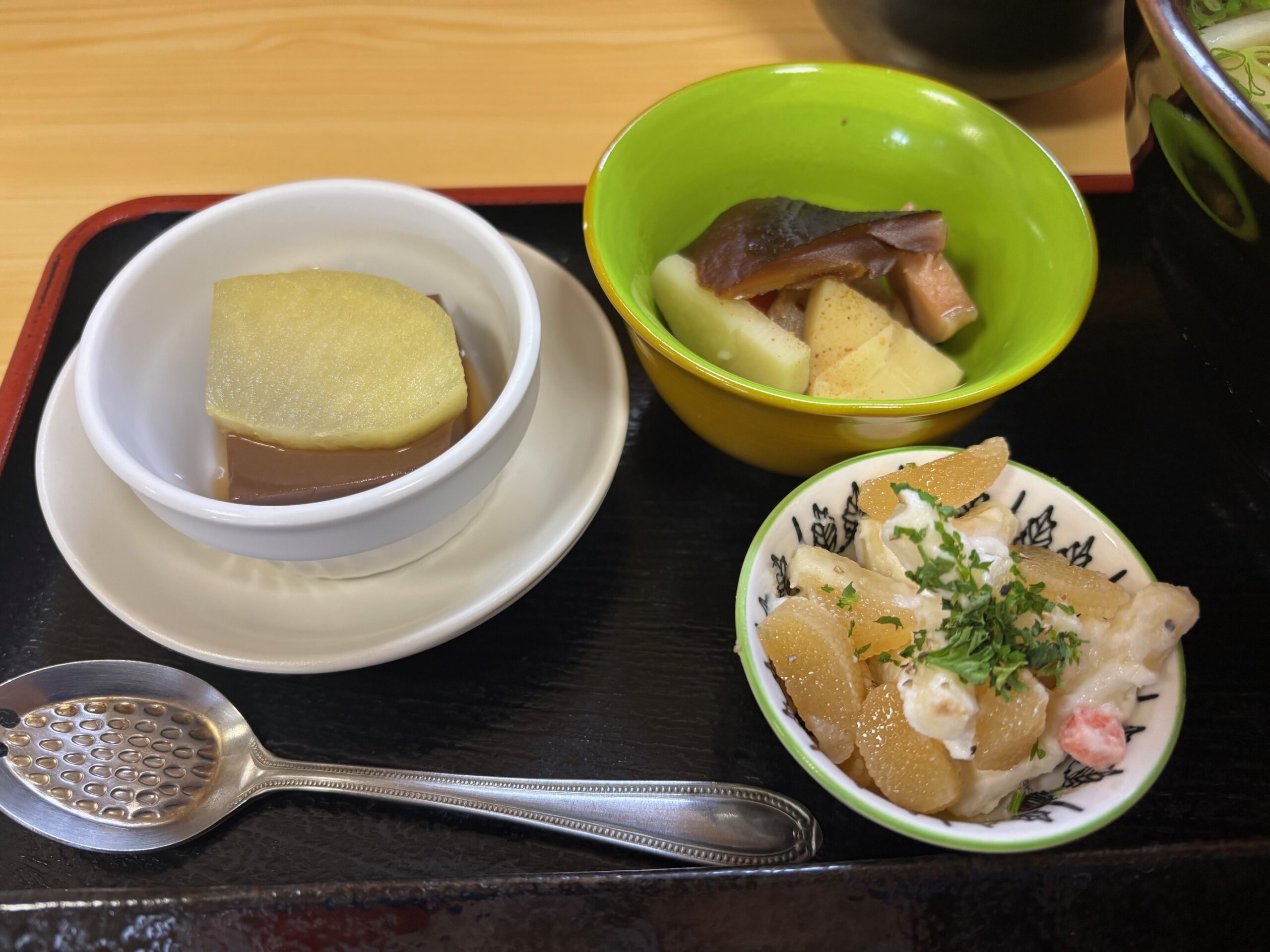 なかでも評判なのが、秘伝の出汁が香るうどん。主役の寿司に並ぶ存在感で、「これを目当てに通う人がいる」というのも納得のおいしさです。小鉢3種は、一品一品丁寧な味つけが嬉しいですね。