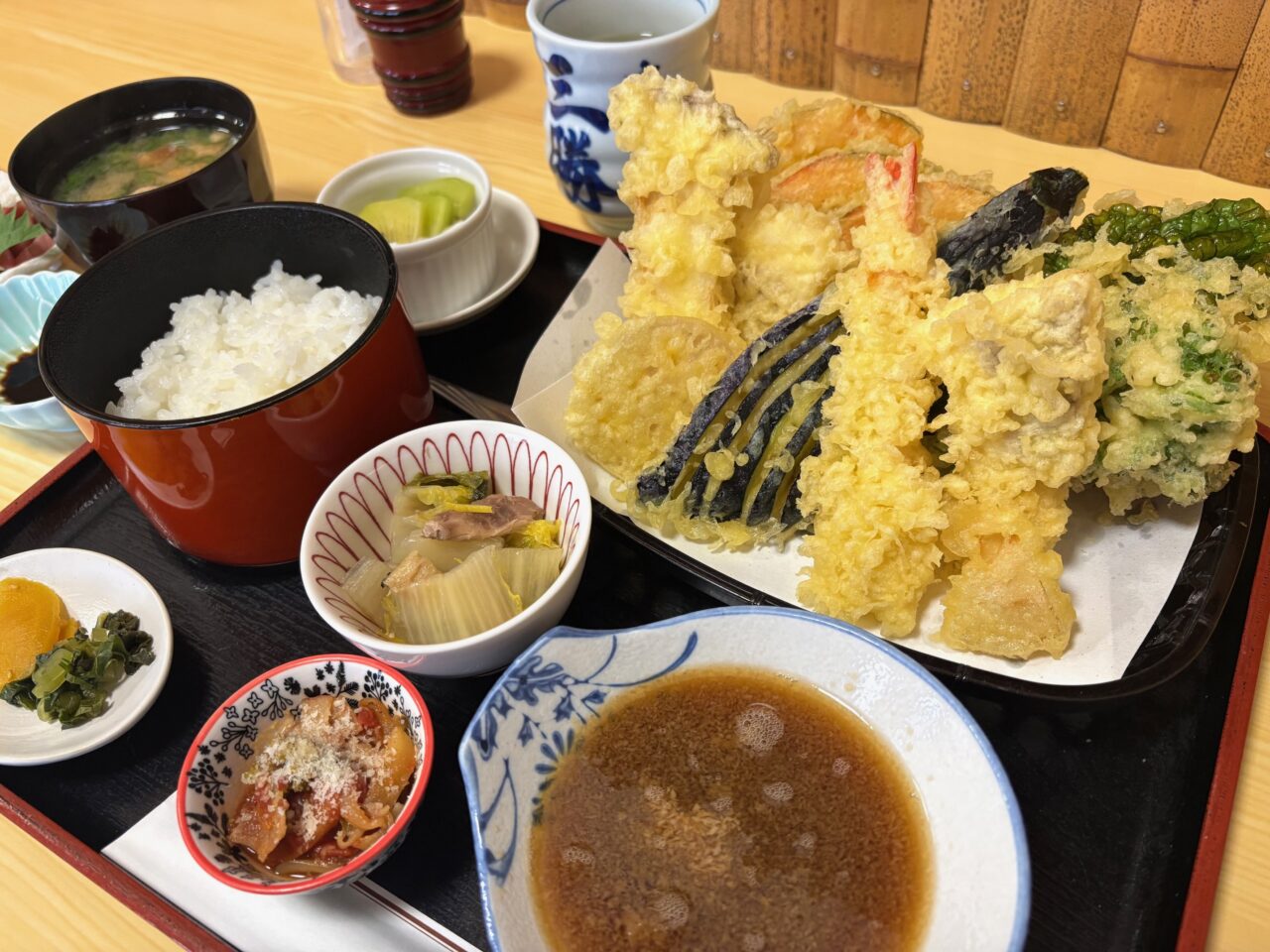 ランチタイムのもう一つの人気メニューが、「天婦羅定食」。エビや白身魚をはじめ、ナス、サツマイモ、レンコン、カボチャなど旬の素材を使った天ぷらがずらりと並びます(内容は季節によって変更)。揚げたてならではのサクサクの衣と素材の甘みが際立ち、ぷりぷりのエビをはじめ、季節の野菜のおいしさが最後まで飽きずに楽しめます。