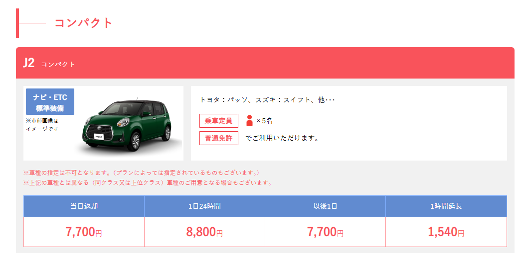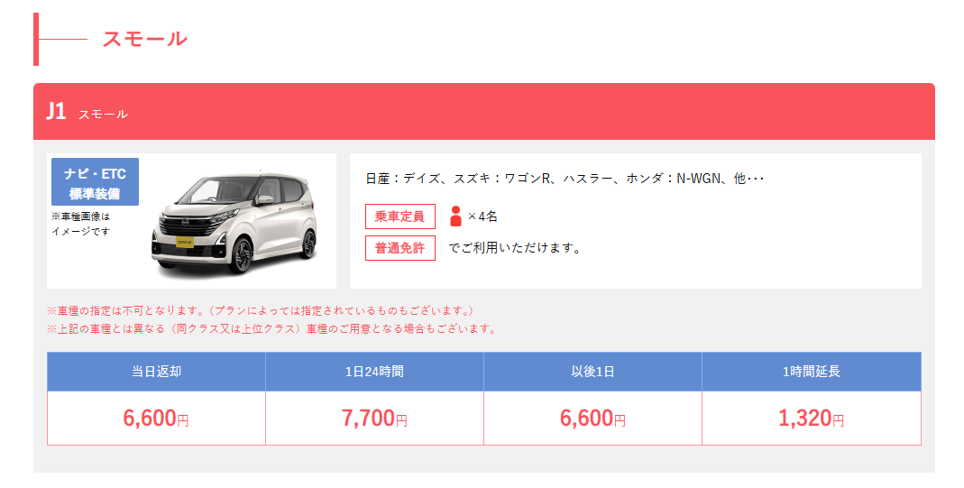料金は「スモール」クラスで6600円~。車種やグレード、利用時間、走行距離などに応じてプランを選べるため、用途に合わせて無駄なく利用できます。家族旅行ならワゴンやミニバン、近距離移動なら軽自動車など、目的に応じた選択が可能です。