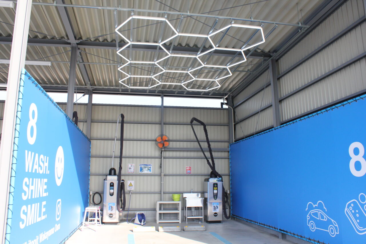 冬季(12月初旬~2月末)は温水が出るのそう。寒い時期はありがたいですね。「8」のブースの屋根下には六角形のLEDユニットが連なる独特の照明「ハニカムライト」が設置されています。汚れや拭きムラが見やすく、夜間でも快適に作業でき、洗車後の愛車をハニカムライトの下で写真撮影もできますよ。