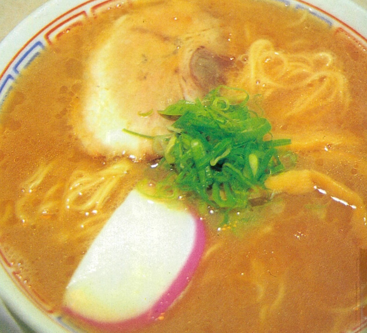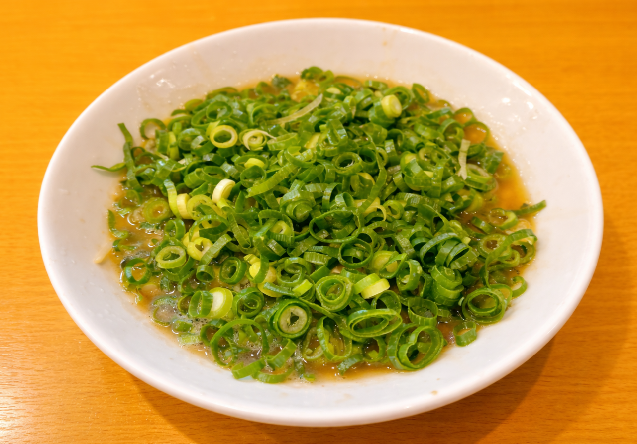 器を覆い尽くすネギの量(写真は通常)。全国的に有名店となった今では見慣れたビジュアルだが、平成初期のころは珍しかった。このビジュアルが注目されつつも現在に至るまで行列の絶えない店になっているのは、やはり味!
