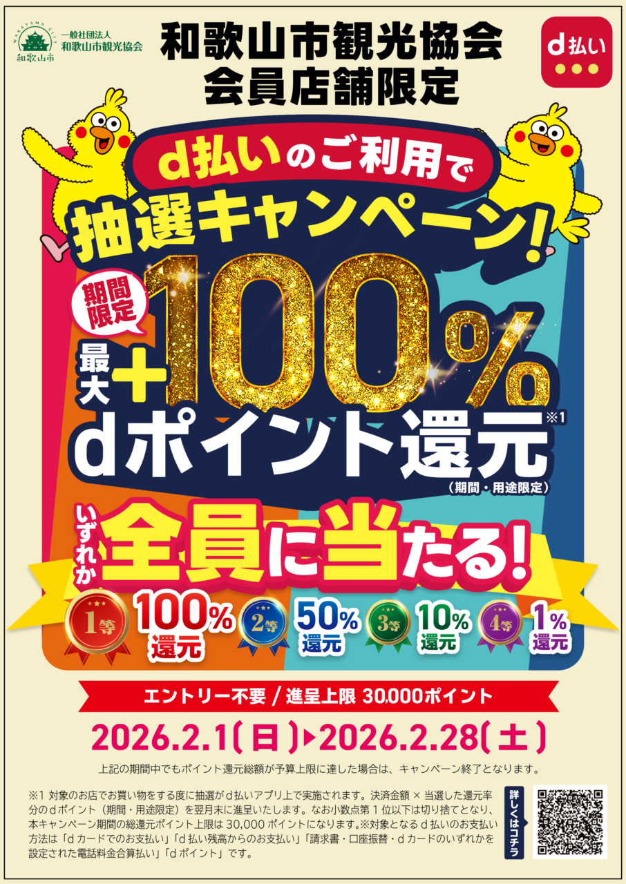 2026年2月1日(日)~2月28日(土)の期間中、和歌山県和歌山市内にある「和歌山市観光協会の会員店舗」での会計時、d払いで支払うと、抽選でdポイントが100%還元されるキャンペーンが実施されます。対象店舗をチェックして、お得な機会にd払いでお買い物を楽しもう♪