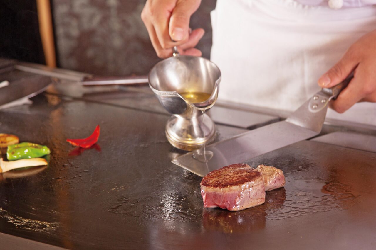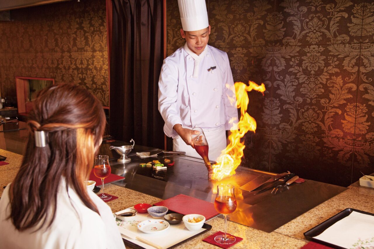 これら厳選された食材を、席前の鉄板で丁寧に焼き上げるスタイル。料理人の見事なナイフさばきの音、ファンタスティックな炎、焼き上がる最上級の肉の香り…。五感で楽しませてくれます。