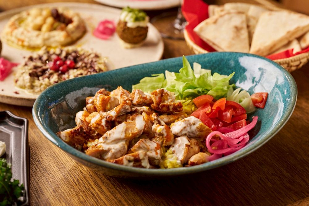ニューヨーカーが愛する定番のストリートフード「チキンオーバーライス」(1600円)。スパイスとハーブに漬け込んだチキンをターメリックライスにのせ、ヨーグルトベースのホワイトソースをたっぷり。ひと口ごとに、スパイスの風味とまろやかさが広がります。