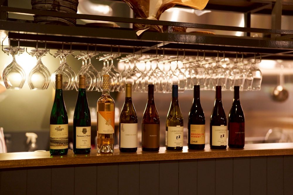 カウンターに並ぶニューヨーク産ワインとともに食事を(グラス1200円~、ボトル7500円~)。