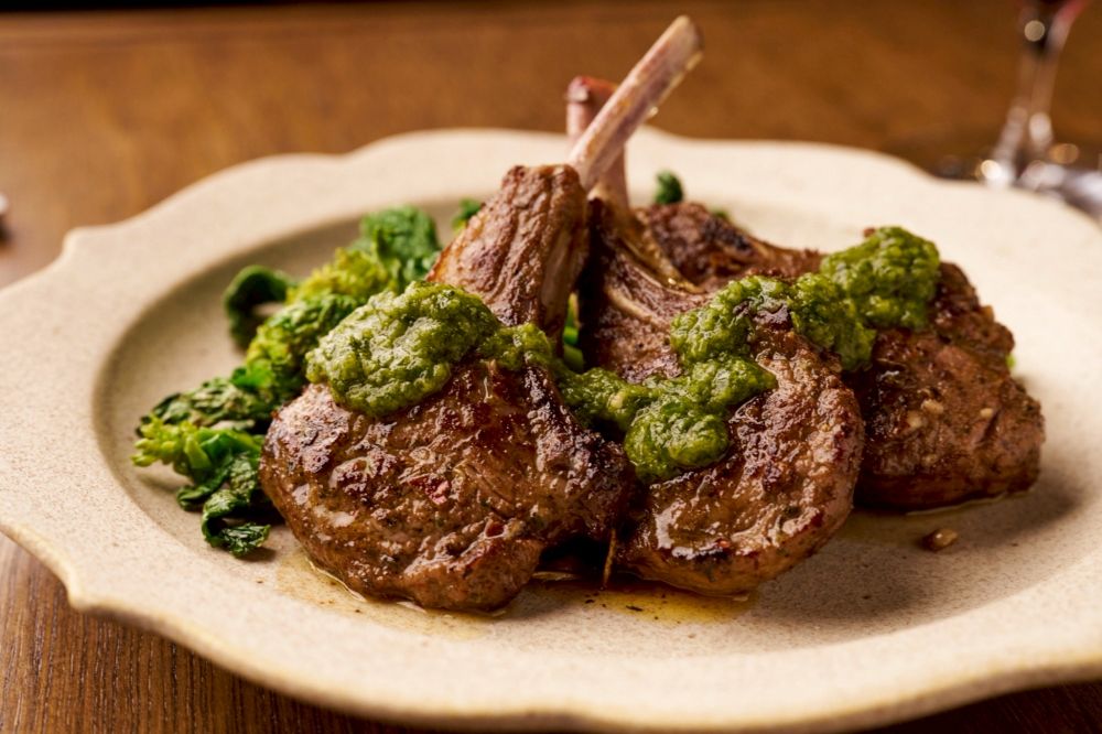 ハーブソースで食べる「ラムチョップ」(3800円~)。数種のハーブのさわやかな香りが、ラム肉のうま味を引き立てています。