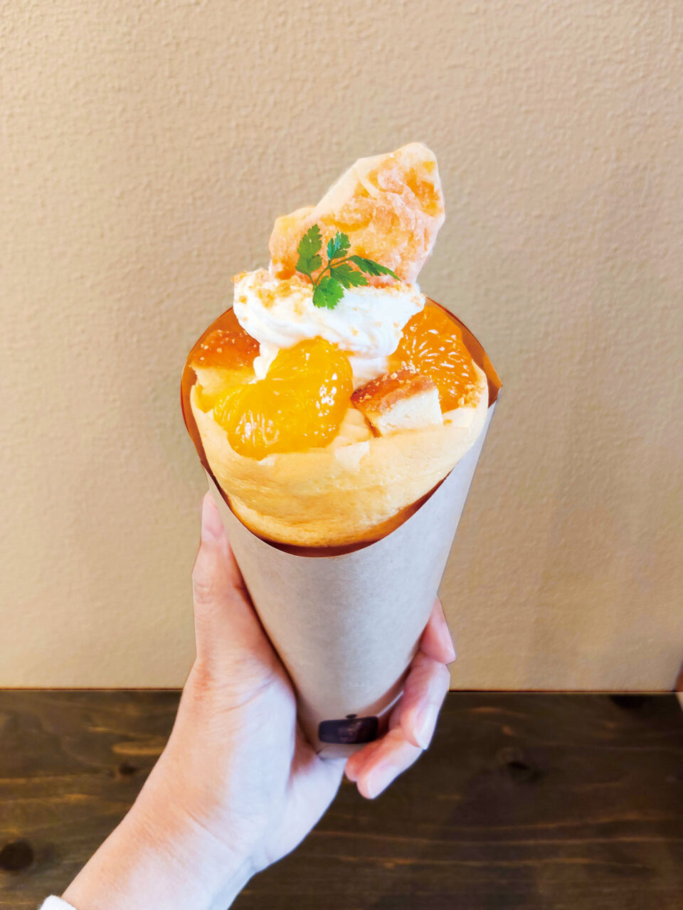 メニューは、「しらすのアヒージョクレープ」(950円)、「甘酒みるく氷~自家製梅ソース~」(900円)、「ホットコーヒー」(350円)など。中でも、甘酸っぱさが心地よい「みかんクレープ」(880円)はおすすめ。