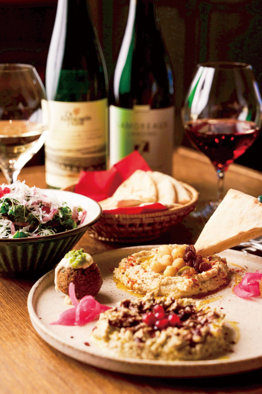 ニューヨークで長年暮らしたオーナーが、現地で親しんだニューヨーク産のワインや中東料理をメインに提供。人気の「メッゼプラッター」は、「フムス(ヒヨコ豆の料理)」などのディップ2種に、前菜とピタパンが付く、シェアにもぴったりの一皿です(2人前2800円~)。
