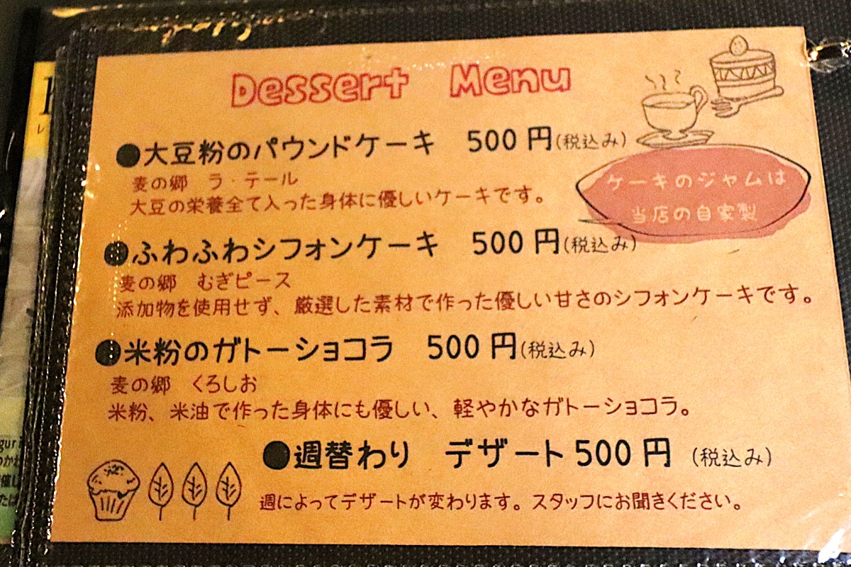 スイーツは、作業所から仕入れており、グルテンフリーのガトーショコラやふわふわシフォンケーキが並びます。今回は、「大豆粉のパウンドケーキ(お茶味)」(単品価格500円)をチョイス!