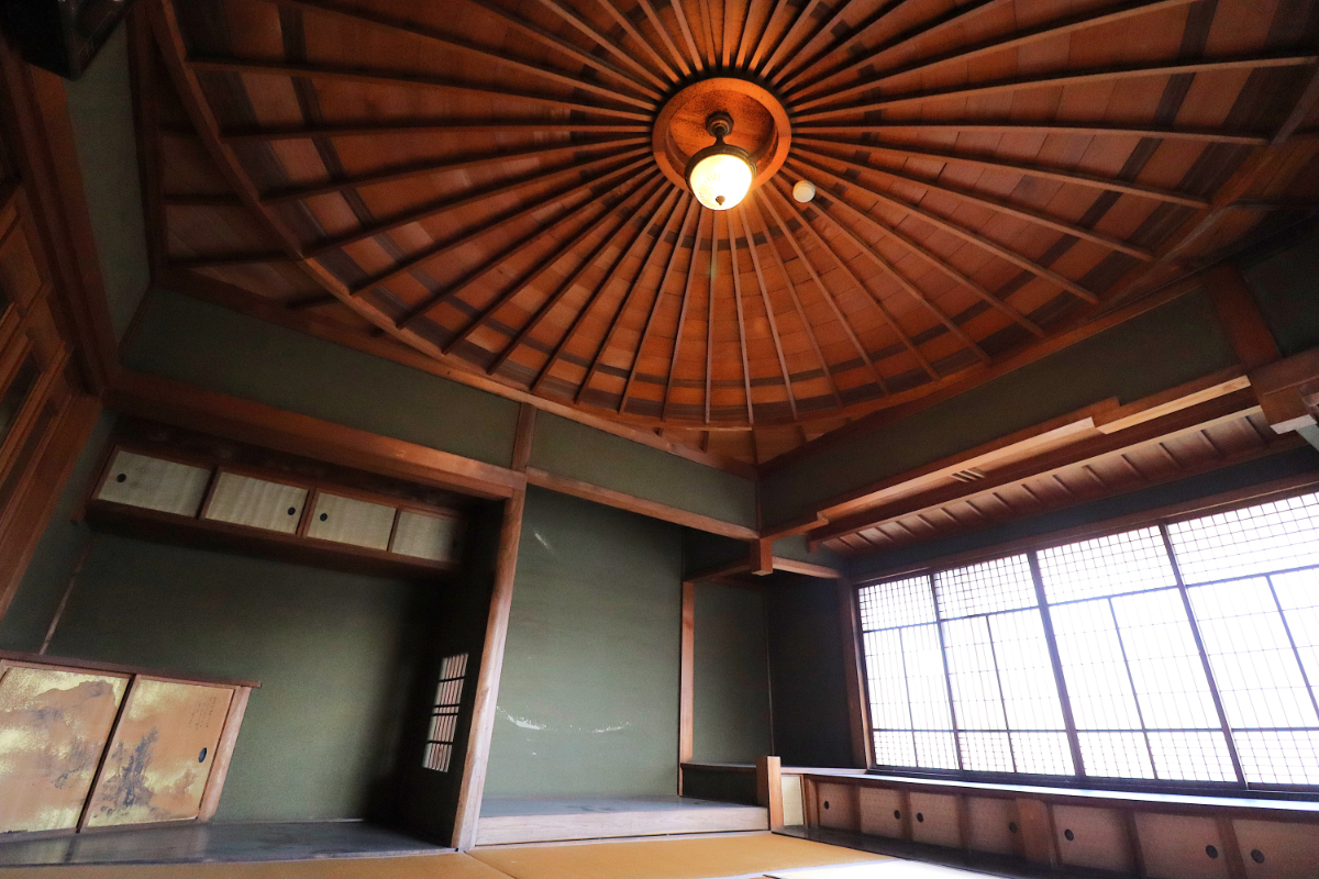 見学希望の際は、スタッフの方に声をかければ、2階に上って建物の中を見ることも可能です。2階には、特徴的な天井を持つ「傘の間」と呼ばれる部屋があり、見上げると思わず足を止めてしまう美しさ。