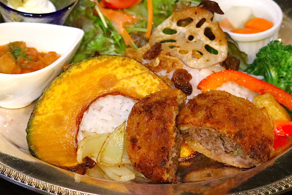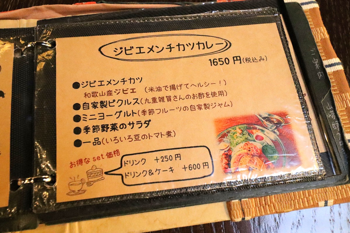 ランチは、定番ランチの「牛すじカレー」(1250円)・毎月内容が変わる「季節限定ランチ」(1250円)・「ジビエメンチカツカレー」(1650円)・子ども用の「キッズランチ」(750円)の4種類。この日は、「ジビエメンチカツカレー」を注文しました。
