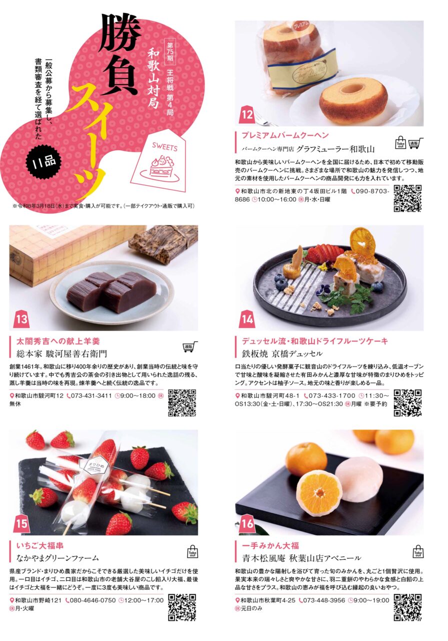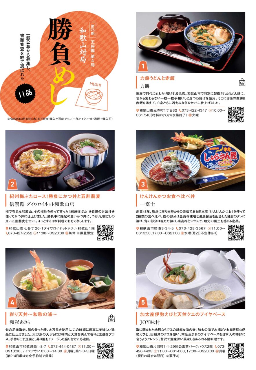 2026年2月17日(火)、18日(水)に和歌山城ホール(和歌山県和歌山市)で開催される「ALSOK杯第75期王将戦 第4局和歌山対局」で、棋士に提供される「勝負めし」「勝負スイーツ」「勝負ドリンク」も、公募の中からついに決定!タイトル保持者(藤井聡太)と挑戦者(永瀬拓矢)は、どのメニューを食すのか…。候補メニューは、2026年3月18日(水)まで一般販売も実施されます。
