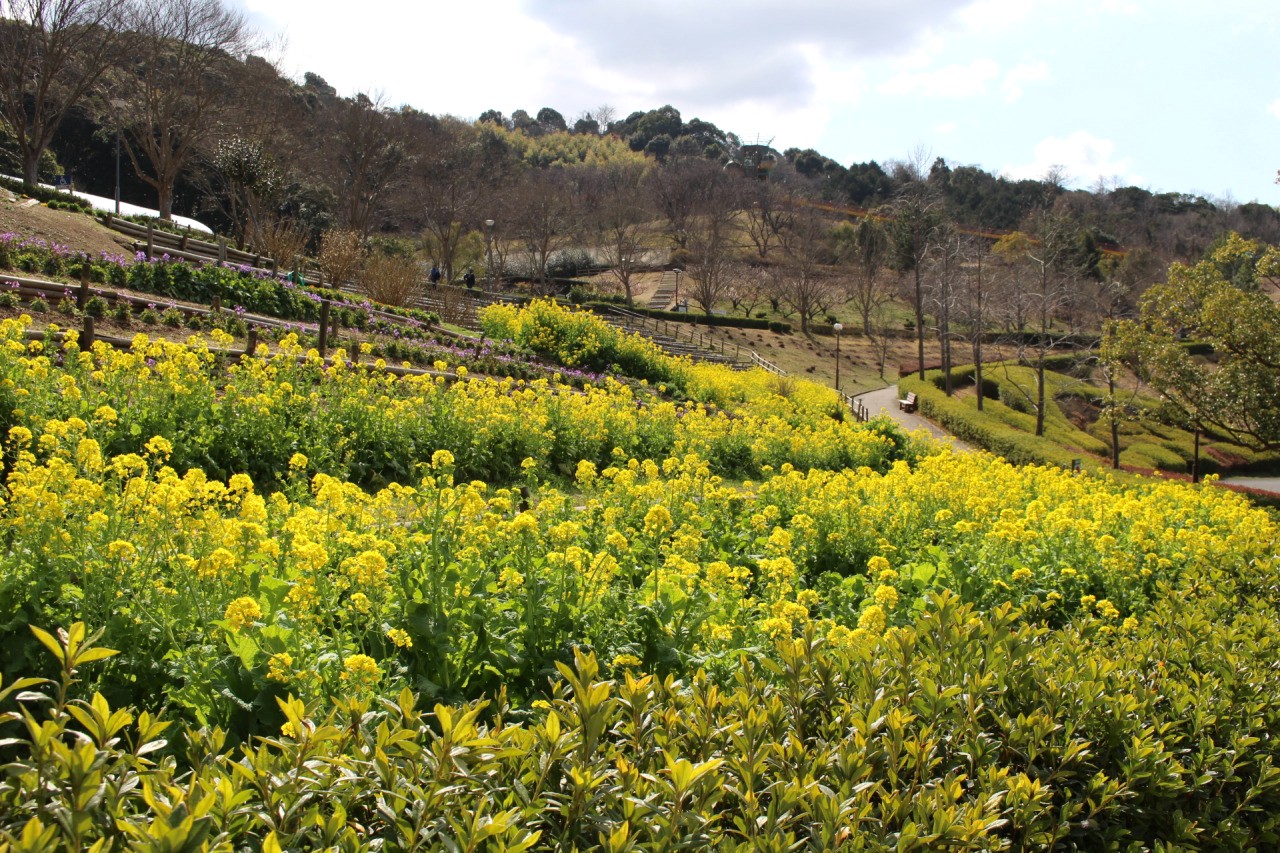 全長38mのローラースライダーなどの大型遊具や、約2万㎡の広さの芝生広場、野外音楽堂・ミューズパークたなべ、田辺市美術美術館など…豊かな自然と文化拠点が息づく「新庄総合公園」。園内では季節折々の花が咲き、田辺市民の憩いの場として愛されています。同公園にも、菜の花畑が!