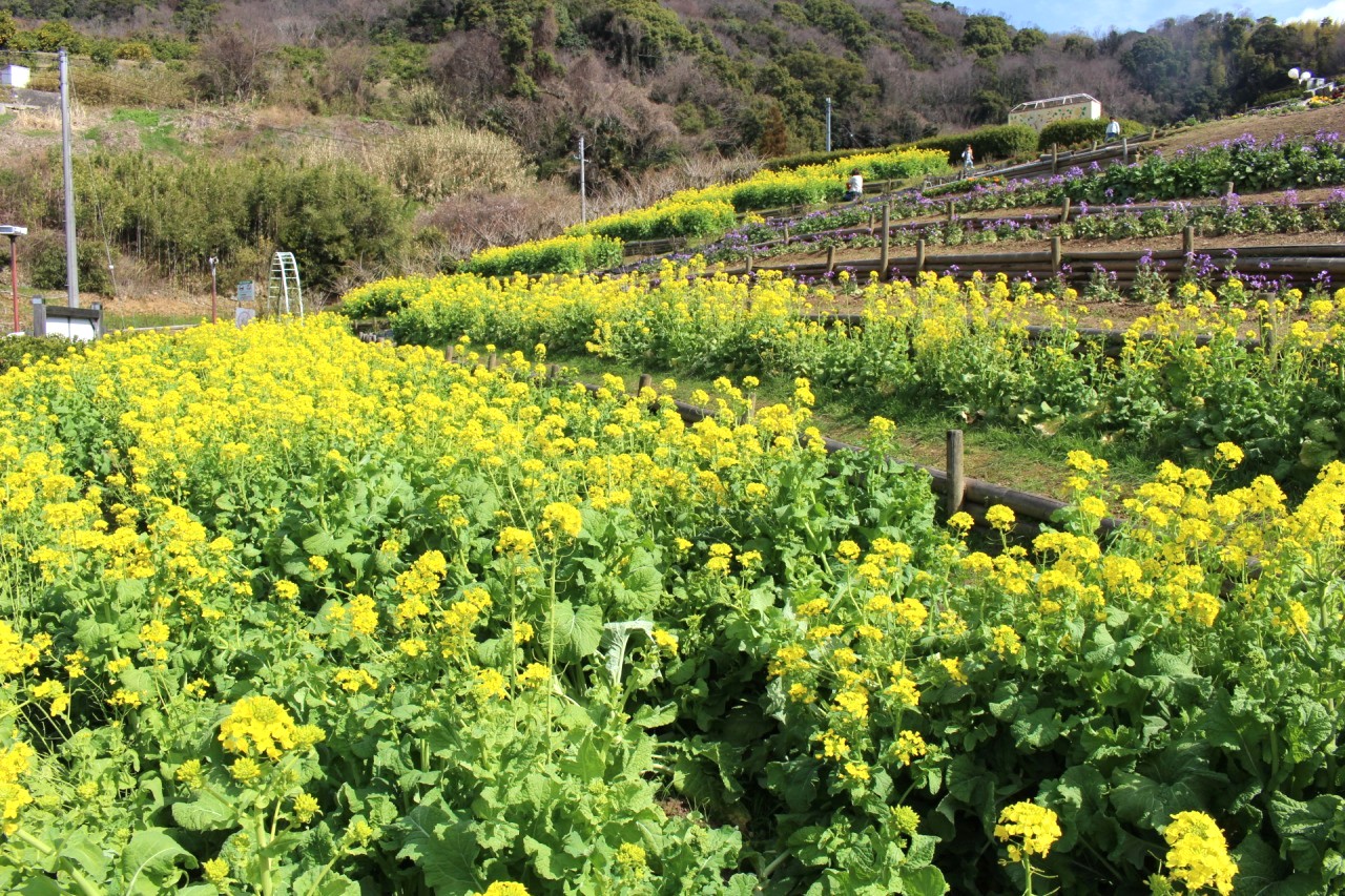 農水産物の直売所にとどまらず、公園やレストラン、収穫体験スポット、など…多彩な体験を通して”おいしいひととき”が堪能できる「紀州 木の街 フルーツが香る 南紀の台 Yottette(よってって)広場」。敷地内にある2カ所の花畑に、菜の花が植えられています。植えられている菜の花は、なんと数万株!