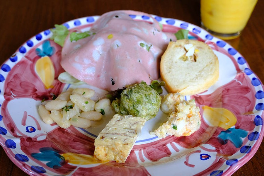 ランチタイムには、+800円で「本日の前菜盛り合わせ」と選べる「ドリンク」が付く「ランチセット」がおすすめ。グリーンサラダ、野菜のマリネ、イタリア風オムレツ、イタリアハムなど…。前菜約7種類が“ちょっとずつ”味わえるのがうれしい。