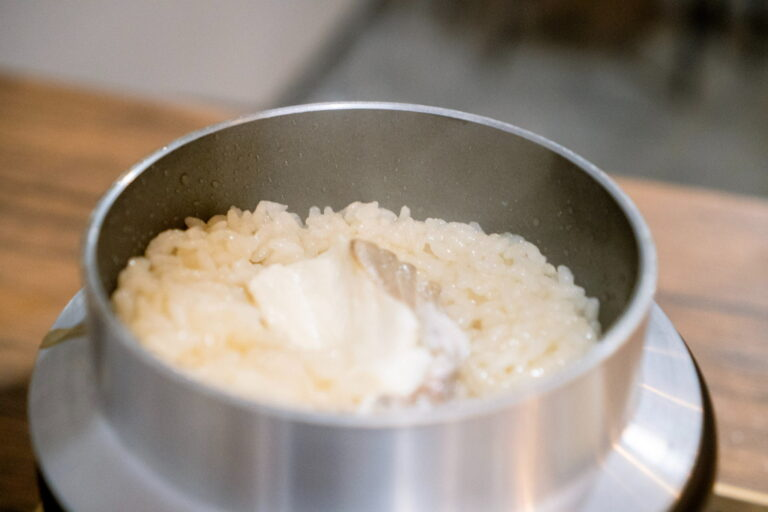 釜飯は注文を受けてから20分ほどかけてテーブルでじっくりと炊き上げます。つやつやと輝くお米の美しさには、思わず歓声を上げてしまうほど。