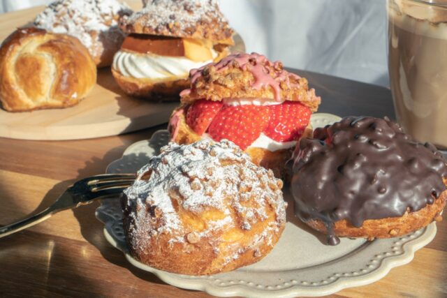 パリパリのシュー皮にカスタードクリームたっぷりの「シューパリ」(194円)、抹茶カスタードの「抹茶パリ」(205円)は定番。「きまぐれイチゴシュー」(324円)、「きまぐれプリンシュー」(324円)は気まぐれで生産。1日に何度も焼きあげるシューパリの香りが店前まで漂います。たっぷりのカスタードクリームは、生地の膨らんでいる部分を下にして“逆さ食べ”をするとクリームがこぼれにくいですよ!