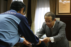 調印式では、合併協議会と県農業協同組合中央会の会長である次本圭吾氏、岸本周平知事が立会人となり、8JAの各組合長らが契約書に署名した。