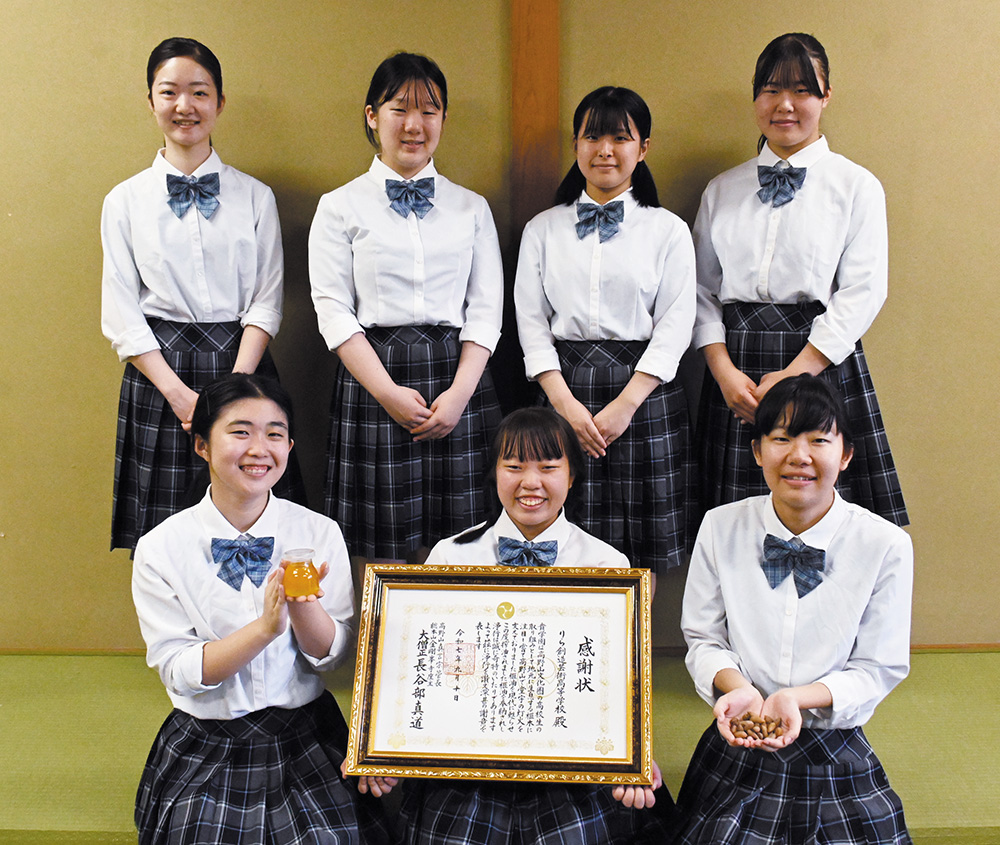 高野山の山麓に位置する紀美野町真国宮のりら創造芸術高校の部活動「りらファクトリー」の生徒たちが、同町で採れた榧(カヤ)の種子から油を搾り、このほど高野町の高野山真言宗総本山金剛峯寺に奉納した。