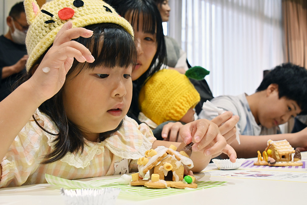 参加者はアイシングで壁や屋根をデコレーションし、ミカンで橋や風車に見立てた飾り付けをしたり、チョコレートで煙突を付けたり、楽しみながら進めていった。