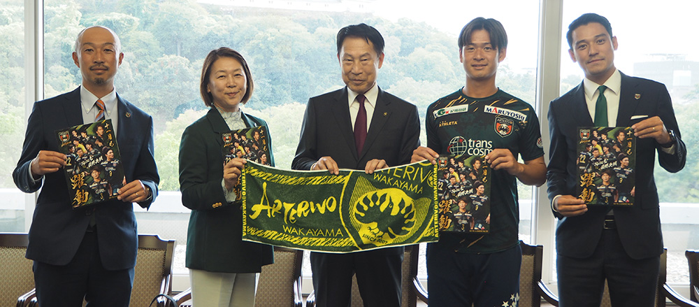 和歌山からJリーグ入りを目指すサッカークラブ、アルテリーヴォ和歌山は4~9月に行われた関西1部リーグで2年ぶり5度目の優勝を果たし、11月の全国地域サッカーチャンピオンズリーグへの出場権を得た。28日には㈱アルテリーヴォ和歌山の児玉佳世子代表取締役、大北啓介GM、三枝寛和監督、小久保裕也主将が和歌山市役所を訪ね、尾花正啓市長に優勝を報告した。