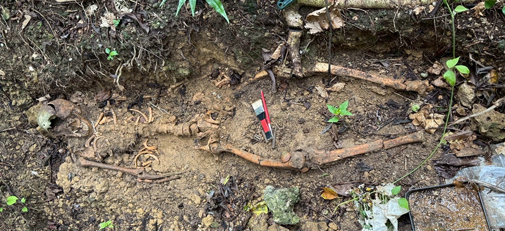 近くから他に、2~3人とみられる苔むした複数の腕や足の骨も発見された。砲弾の破片とみられるさびた金属片、ベルトのバックル、野戦電話機の一部なども見つかり、陶器の破片があったことから、軍人を含む複数人が生活していたことも想像される。