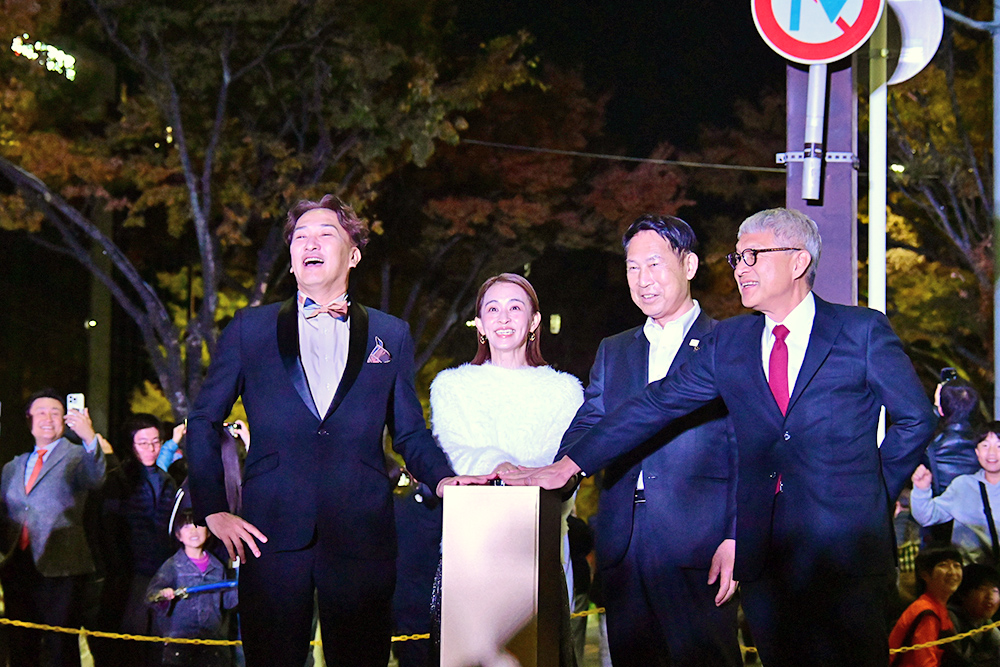 家族で来た男性(31)は「とてもきれい、家族で歩けてうれしい。ずっと続いてほしい」、妻(29)は「昨年、夜泣きする子どもを車に乗せて、このイルミネーションの道を何周もドライブした特別な場所。きれいだねと話しかけ泣きやんだ思い出があり、ことしは点灯式に絶対来たかった」と話した。