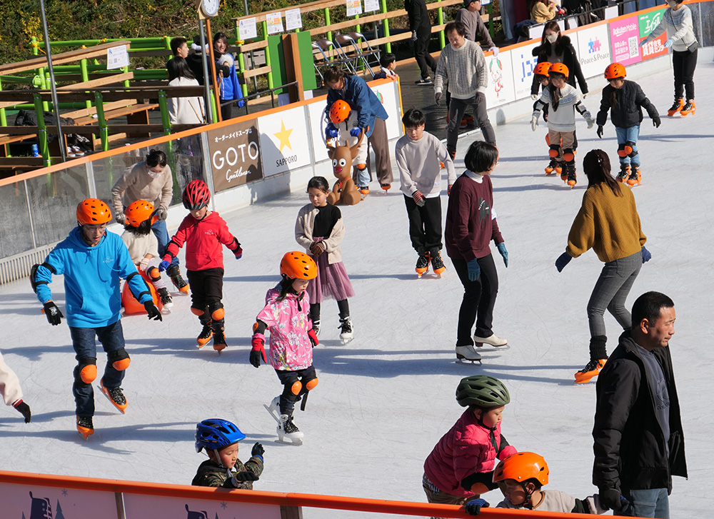 初心者や幼児にはトナカイやアシカの形をした補助具の貸し出しもあり、大勢でにぎわうリンクは大きな笑い声と、元気いっぱいの絶叫が青空に響いていた。