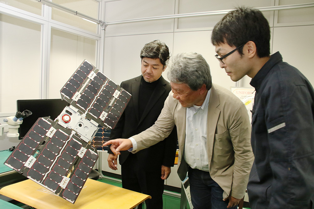 【写真】超小型人工衛星のモデルの前で語らう有井社長㊧、秋山教授㊥ら
