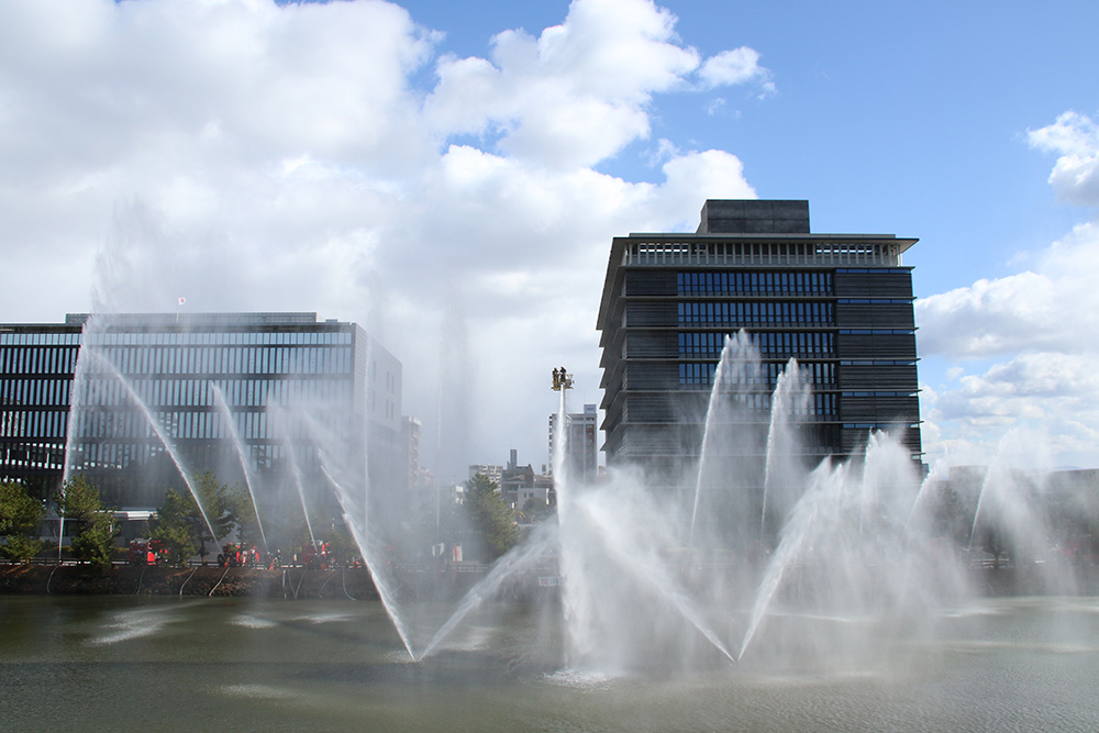 和歌山城の東側堀端では、消防局のはしご車と消防団代表の車両、堀の中の噴水を使用した放水演技が行われた。空や堀に向けて勢いよく水が放たれ、和歌山の頭文字「W」を描くなどし、多くの市民が見物した。城前広場では緊急車両の展示や体験乗車、子ども向けに消防隊員の制服着用体験などが行われ、親子連れらが楽しんでいた。